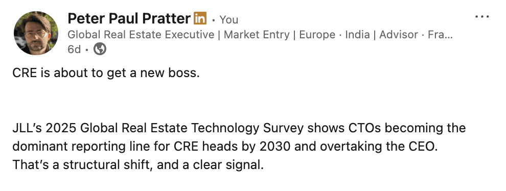 JLL’s 2025 Global Real Estate Technology Survey shows CTOs becoming the dominant reporting line for CRE heads by 2030 and overtaking the CEO.