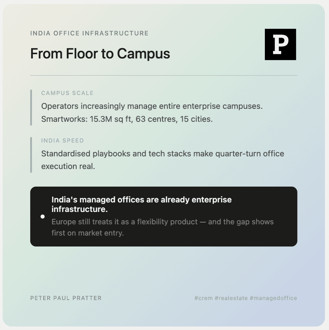 Around 10% of India’s office stock is already managed space, a share that would look extraordinary in most European markets, where managed offices are still treated as a pure flexibility tool rather than core enterprise infrastructure.