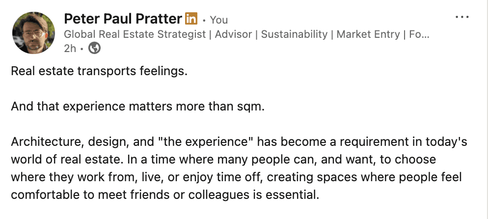 Architecture, design, and "the experience" has become a requirement in today's world of real estate. In a time where many people can, and want, to choose where they work from, live, or enjoy time off, creating spaces where people feel comfortable to meet friends or colleagues is essential.