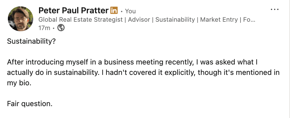 After introducing myself in a business meeting recently, I was asked what I actually do in sustainability. I hadn't covered it explicitly, though it's mentioned in my bio.