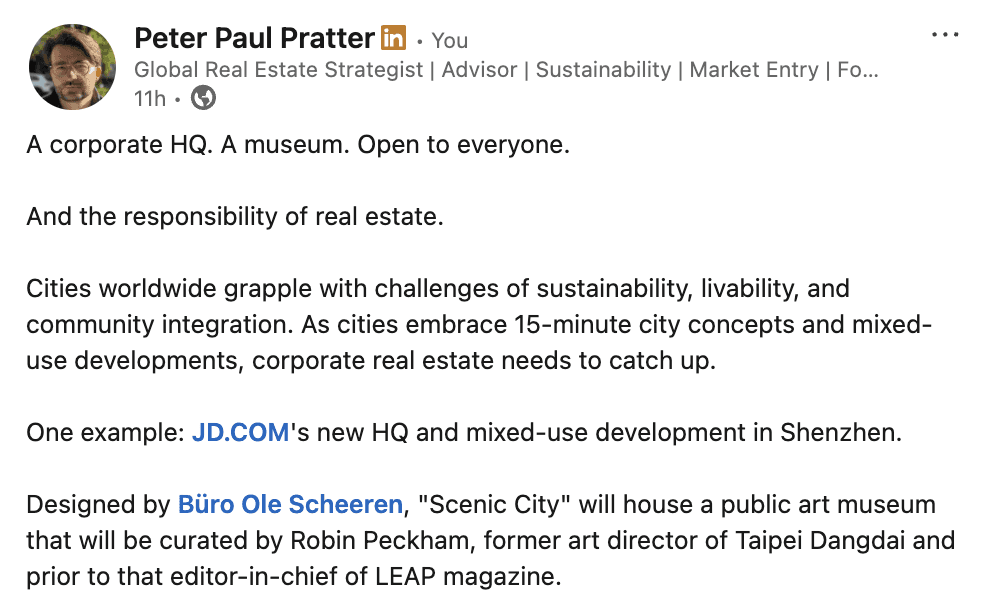 One example: JD.COM's new HQ and mixed-use development in Shenzhen.